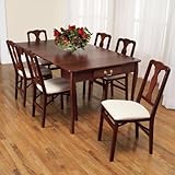 3-in-1 Convertible Table. Versatile console table converts to a card table and then a full-sized dining table that seats six. For entertaining, special occasions or for everyday use, this 3-in-1 table does it all. Place it by the couch to showcase your favorite photos and knick-knacks. Or, open it up for a light meal or a night of cards. Then, for those Sunday dinners or holiday feasts, the table expands to become a traditional dining table that seats up to six people. It's a console table that converts to a card table and then a full-sized dining table in minutes--with all the durability and good looks of fine furniture. Classic table is constructed of hardwood with a rich Cherry finish. Includes a middle brace leg and two 16" l x 40" w leaves. For a complete dining set, add our classic Queen Ann folding chairs (sold separately) with premium upholstered seats. When folded, they store compactly in very little space. Dimensions: Console table: 40" w x 20" l x 30" h Game table: 40" w x 40" l x 30" h Dining table: 40" w x 72" l x 30" h Order an expandable table from Brookstone, and get three pieces of furniture in one with fast, easy set-up.